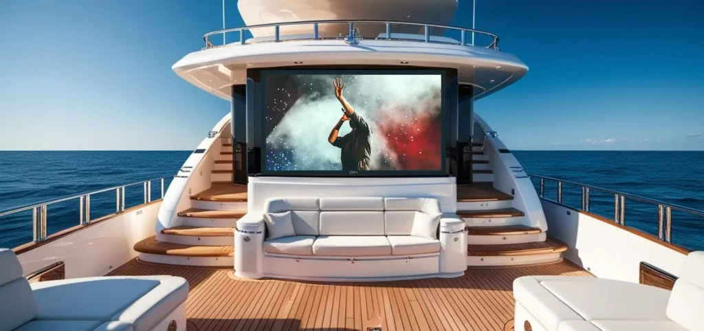 • Outdoor TVs & Displays: Ultra-bright, anti-glare marine televisions and modular LED video walls designed for open decks and exterior lounges, delivering cinema-style entertainment with clear visibility even in direct sunlight.